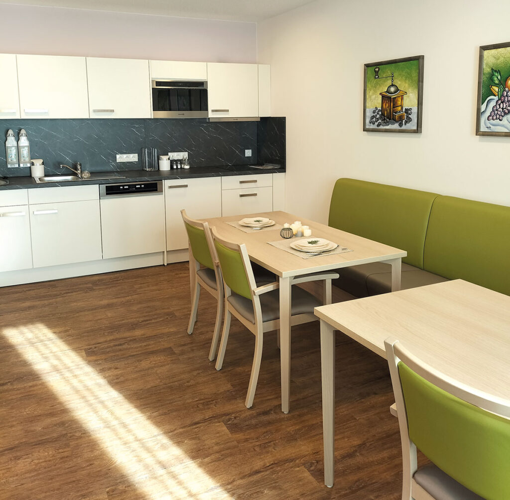Ergänzend dazu verfügt jeder Wohnbereich über eine eigene Wohnküche. Das gemeinsame Essen ist für uns ein besonderer Moment des Miteinanders und der Geborgenheit. So schaffen wir einen Ort, an dem jeder Tag mit Freude, Leichtigkeit und Wärme erfüllt ist.